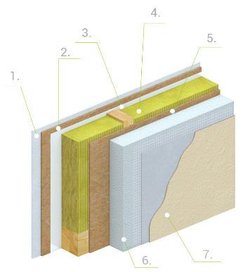 | A | Gips karton 12.5mm | OSB ploča 10mm | VC folija (parna brana) | Mineralna vuna 10cm | Obrađeno drvo (friz) 5x10cm | OSB ploča 10mm | drvena pod-konstrukcija (roštilj) za fasadnu dasku | stiropor 10cm | termopropusna folija | završna obrađena fasadna daska |